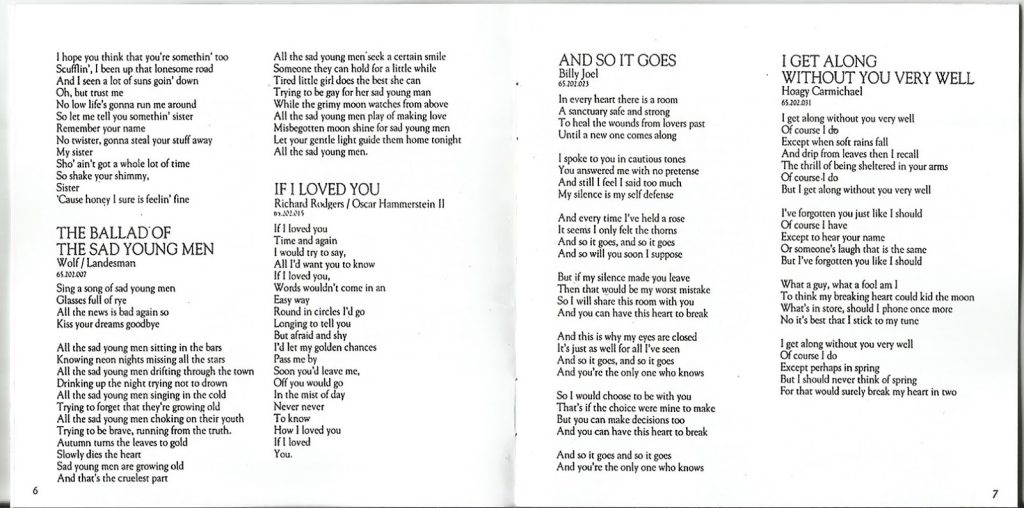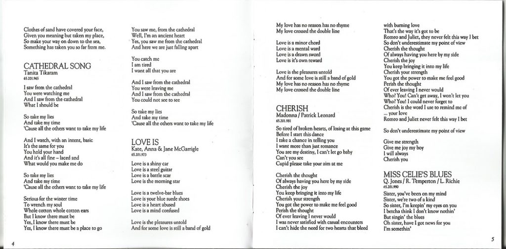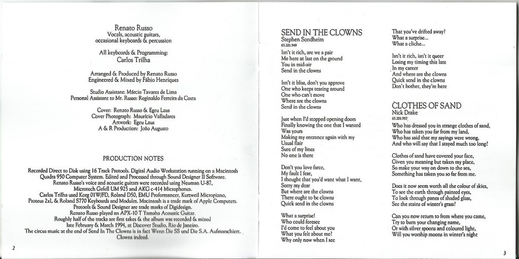 A canção Clothes of Sand, de Drake, é a faixa dois desse lançamento solo do artista brasiliense. O disco também inclui Cathedral Song de Tanita Tikaram, que mais tarde ganharia uma versão em português feita por Zélia Duncan. Há ainda canções de Madonna, Bob Dylan, Quincy Jones, Lionel Richie, Gretchen Cryer e outros nomes importantes.